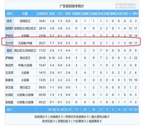 最终,王少杰打了20分21秒,交出了全队第二高的17分,外加2助攻1抢断2盖帽的数据,正负值为+16,是全队效率最高的球员。毫无疑问,王少杰就是广东队击败山西队的一个奇兵,成为了比赛的胜负手。