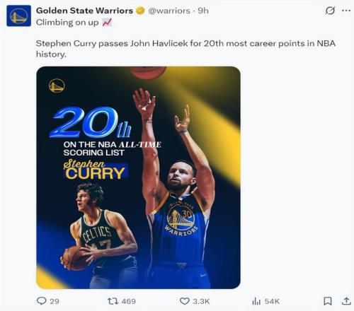 这场比赛后库里常规赛得分26397分超过哈夫利切克,和皮尔斯并列历史第19,距离第18位的邓肯还差99分,库里迎来了里程碑的夜晚。